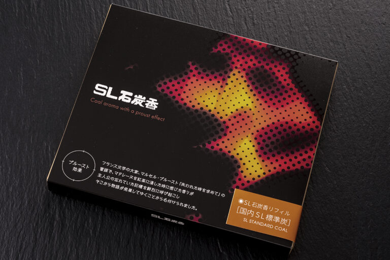 SL石炭香は、本物の石炭を原料としてそれを粉砕し、線香状に固化したもので、着火するとほのかな石炭の香りが漂います。