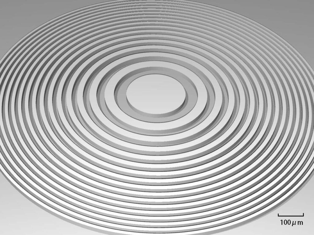 構造は透明素材に同心円状の階段構造を形成し、段差を光の波長(550ナノメートル)単位で設計。これにより入射光をすべて利用でき、焦点での光強度は振幅型の約4倍となります。さらに直線光の減少により、ハローの少ないクリアな画像を提供します。